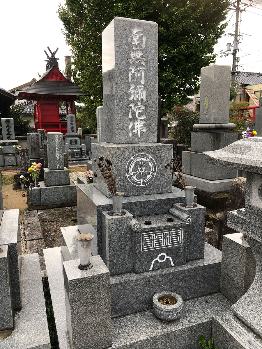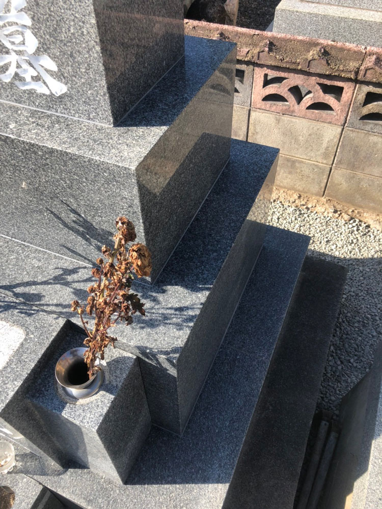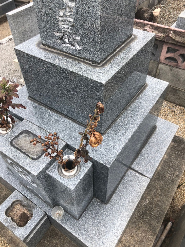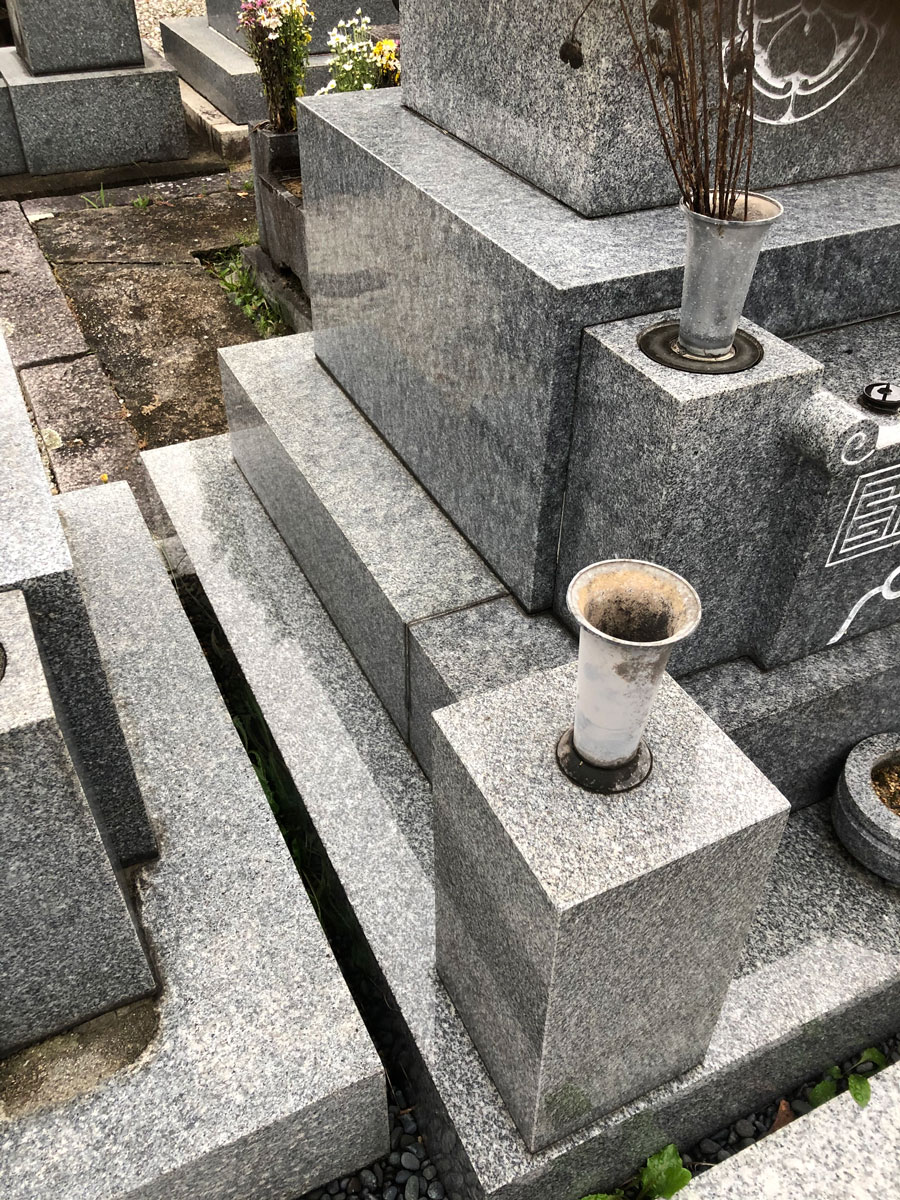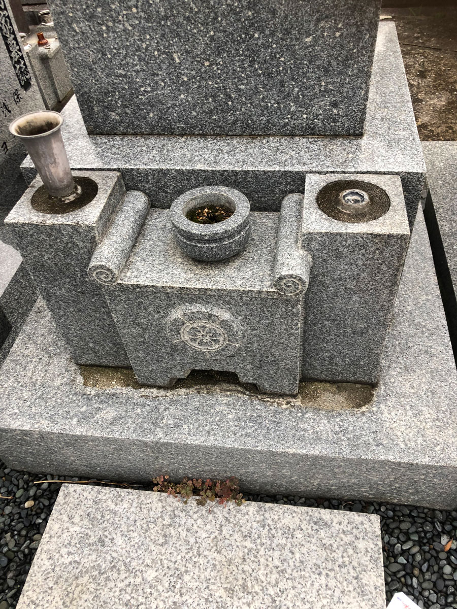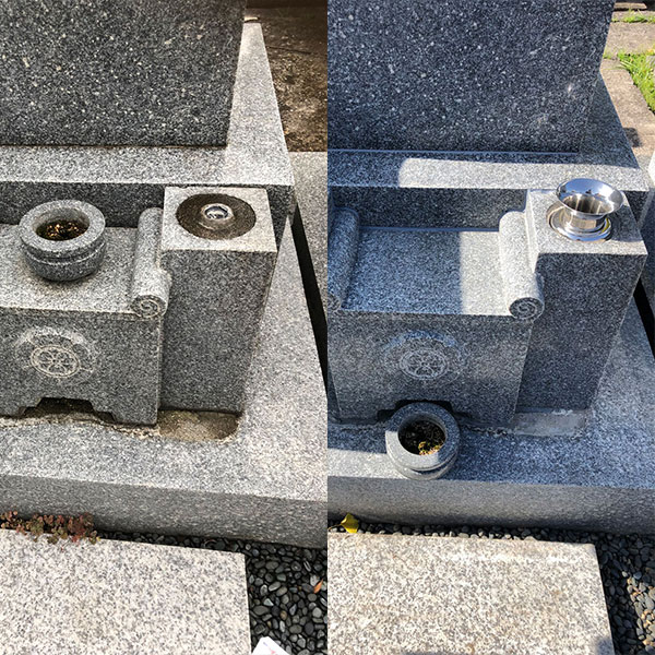 墓石のきわに、黒い水垢・苔がこびりついています。これを洗浄して、磨き、必要な箇所には、補修をして、文字に色を入れています。